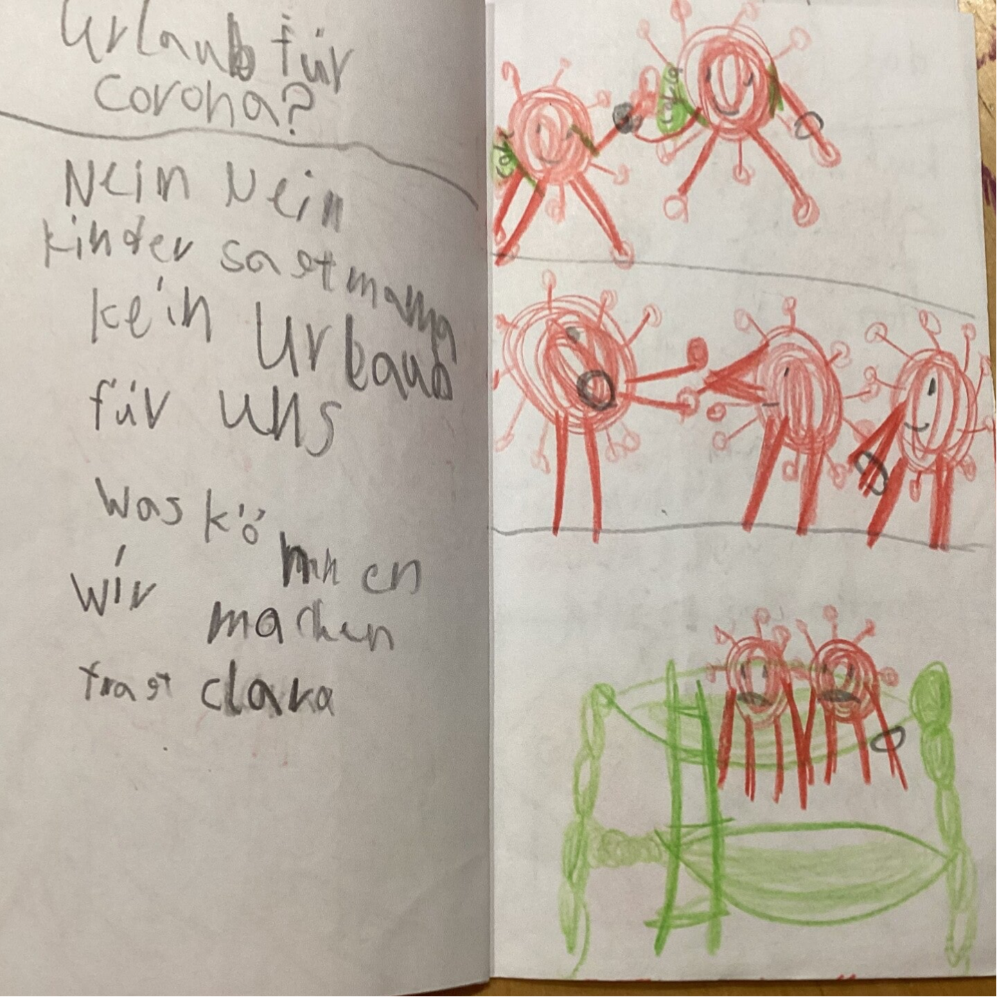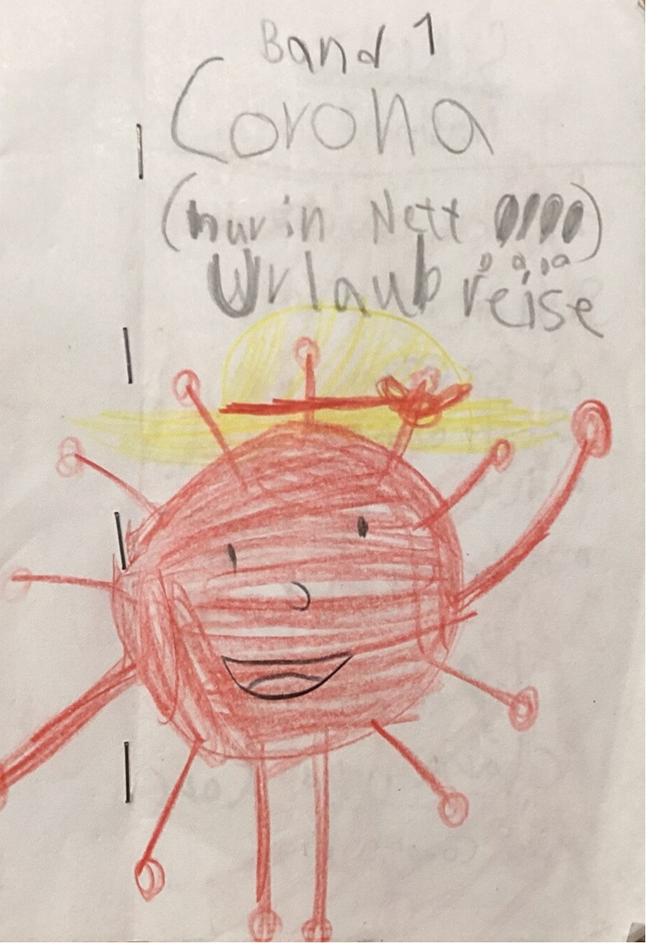 In der Covidschule sagt der Lehrer: „Es ist etwas schlechtes geschehen. Alle Menschen machen Urlaub.“ „Oh“, denken Clara und Carl, zwei Coronaviren.